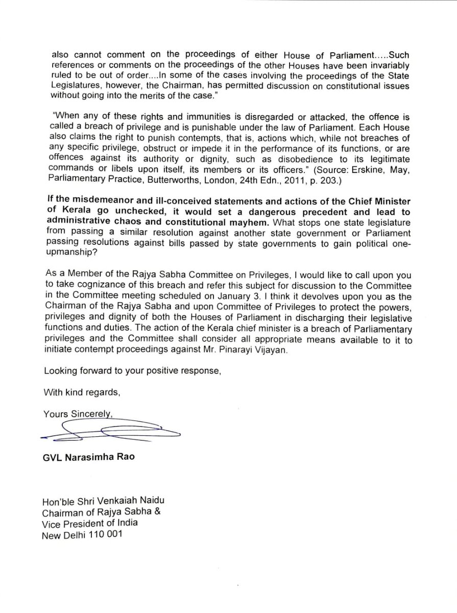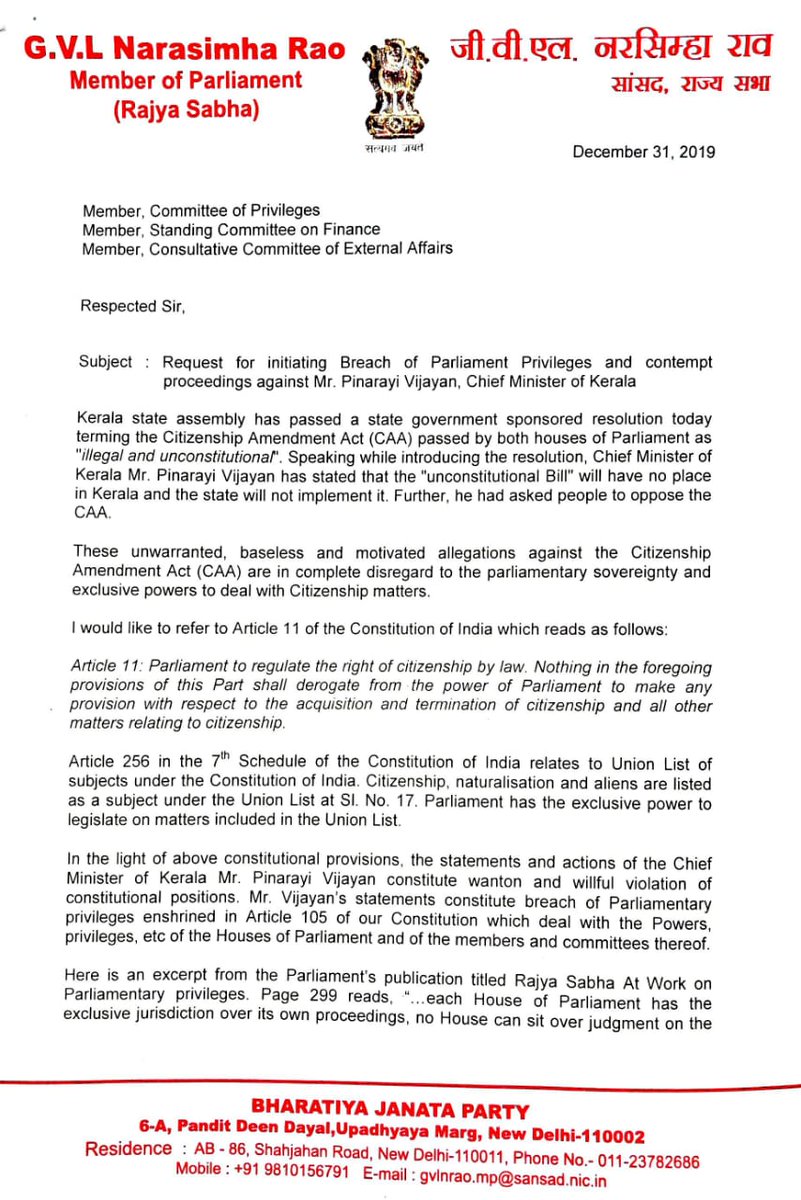 Gvl Narasimha Rao A Twitter As A Member Of The Committee On Privileges In Rajya Sabha I Have Written To Chairman Of Rajya Sabha Seeking Breach Of Parliament Privileges Contempt Proceedings