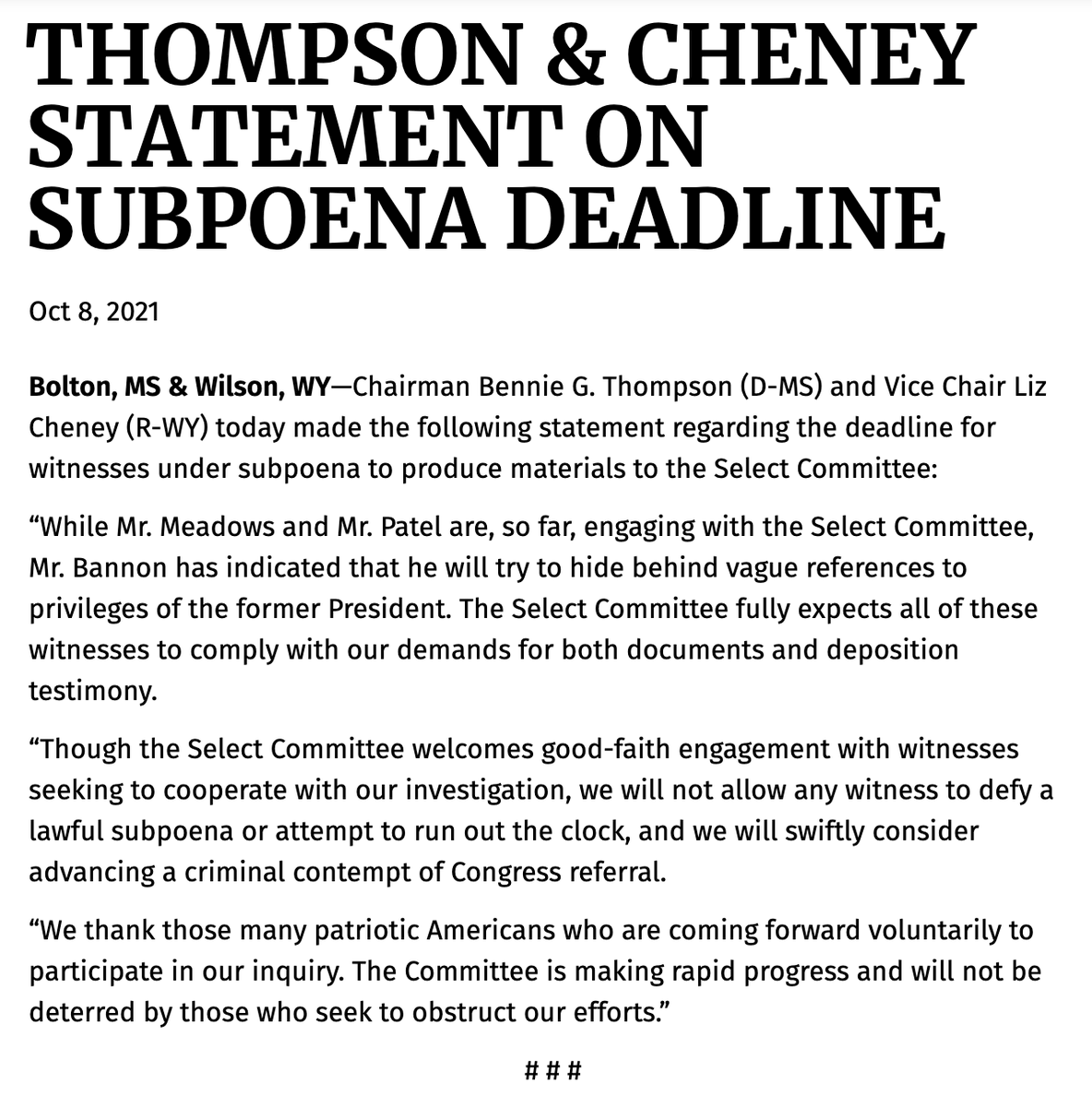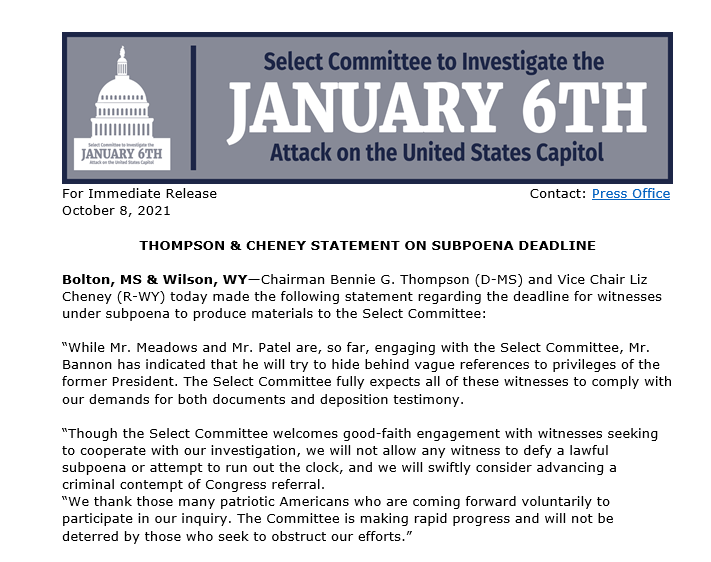 Sahil Kapur على تويتر Jan 6 Committee On The First Batch Of Subpoenas While Mr Meadows And Mr Patel Are So Far Engaging With The Select Committee Mr Bannon Has Indicated That